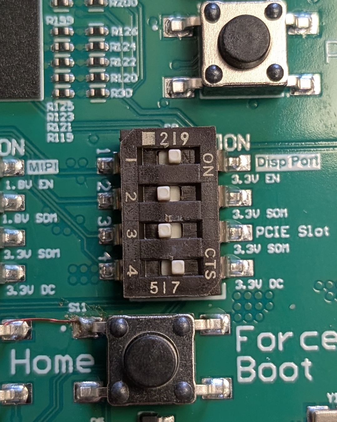 - Switch 2 should NOT be set for Rev 1 or 2 of the Development Board as 3.3V from the SOM may actually be a higher volage. See MitySOM-QC6490 Development Kit Datasheet